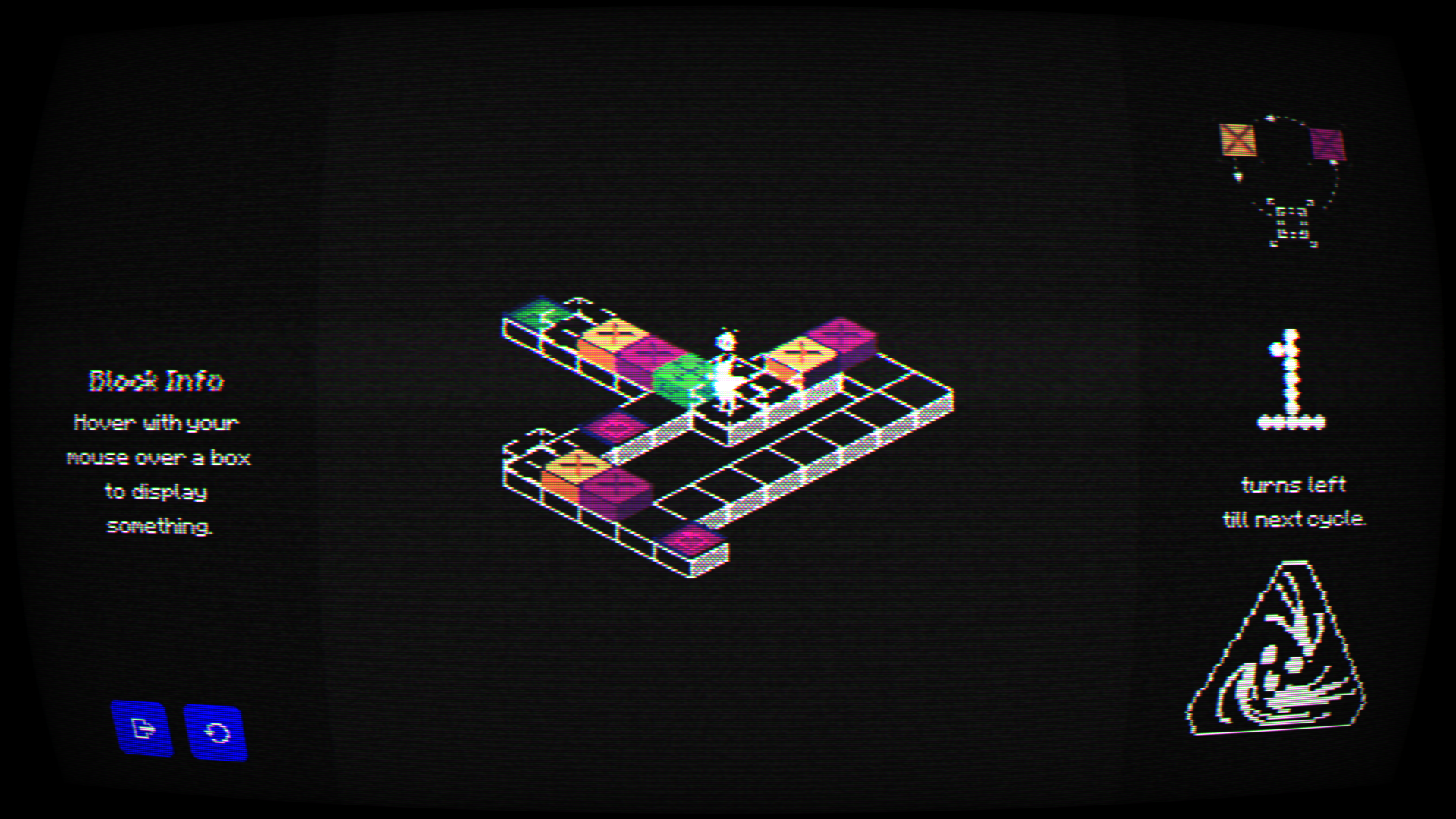 In this game you follow the Re::Inforce Training Initiative to climb up till you reach your final destination. The levels consists mainly of blocks, which have different types and loop through their different states, which will make you think in advance.